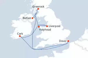 Itinerario : Dover, Cork, Dun Laoghaire, Liverpool, Holyhead, Greenock, Belfast, Dover