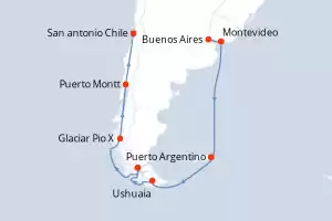 Itinerario : Buenos Aires, Montevideo, Puerto Argentino, Ushuaia, Punta Arenas, Glaciar Pio X, Puerto Montt, San antonio Chile