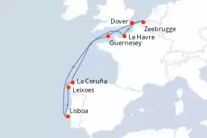 Itinerario : Dover, Guernesey, Lisboa, Leixoes, La Coruña, Le Havre, Zeebrugge, Dover