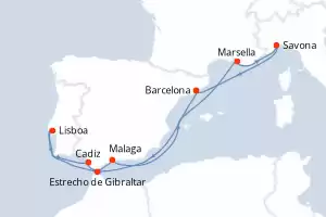 Itinerario : Marsella, Savona, Barcelona, Estrecho de Gibraltar, Lisboa, Cadiz, Malaga, Marsella