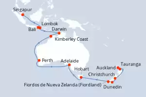 Itinerario : Auckland, Tauranga, Christchurch, Dunedin, Fjordland, Hobart, Adelaide, Perth, Kimberley Coast, Darwin, Bali, Lombok, Singapur