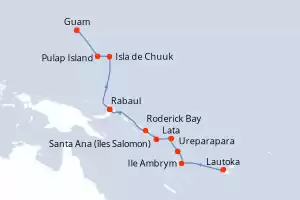 Itinerario : Lautoka, Ile Ambrym, Ureparapara, Lata, Santa Ana (îles Salomon), Roderick Bay, Rabaul, Isla de Chuuk, Pulap Island, Guam