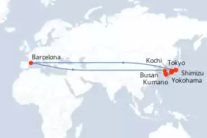 Itinerario : Barcelona, Tokyo, Yokohama, Tokyo, Kumano, Shimotsu, Kochi, Busan, Nagasaki, Kagoshima, Shimizu, Kyoto, Yokohama, Tokyo, Barcelona