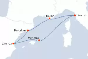 Itinerario : Barcelona, Toulon, Livorno, Menorca, Valencia, Barcelona