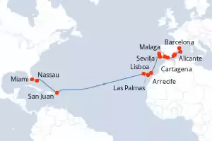 Itinerario : Barcelona, Palma de Mallorca, Alicante, Cartagena, Malaga, Sevilla, Portimao, Lisboa, Arrecife, Las Palmas, Santa Cruz de la Palma, San Juan, Nassau, Miami