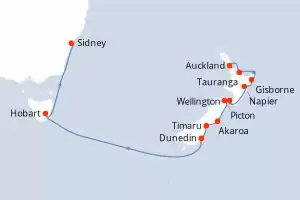 Itinerario : Sidney, Hobart, Dunedin, Timaru, Christchurch, Picton, Wellington, Napier, Gisborne, Tauranga, Auckland