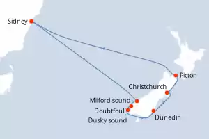 Itinerario : Sidney, Milford sound, Doubtfoul, Dusky sound, Dunedin, Christchurch, Picton, Sidney