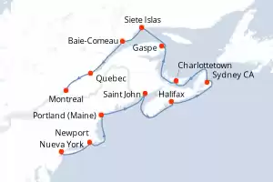 Itinerario : Nueva York, Boston, Portland (Maine), Saint John, Halifax, Sidney, Charlottetown, Gaspe, Siete Islas, Saguenay, Quebec, Montreal