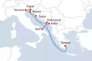 Itinerario : Venecia, Koper, Rovinj, Zadar, Spetses, Dubrovnik, Katakolon, Githion, Milos, El Pireo Atenas, Venecia, Koper, Rovinj, Zadar, Spetses, Dubrovnik, Katakolon, Githion, Milos, El Pireo Atenas