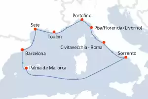 Itinerario : Barcelona, Sete, Toulon, Portofino, Pisa/Florencia (Livorno), Civitavecchia - Roma, Sorrento, Palma de Mallorca, Barcelona