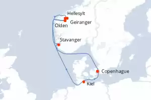 Itinerario : Copenhague, Hellesylt, Geiranger, Olden, Stavanger, Kiel, Copenhague